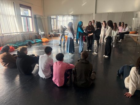 Im Anschluss nahmen die Jugendlichen an einem Schauspiel-Workshop teil. Unter der Anleitung erfahrener Theaterpädagoginnen und -pädagogen erprobten sie, wie man mit Stimme, Mimik und Gestik wirkt, und lernten, was Körpersprache über die eigene Persönlichkeit verrät.