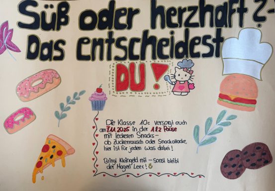 Die Klasse 10c versorgt euch am 7.11.2025 in der 1. & 2. Pause mit leckeren Snacks - ob Zuckerrausch oder Snackattacke, hier ist für jeden was dabei!